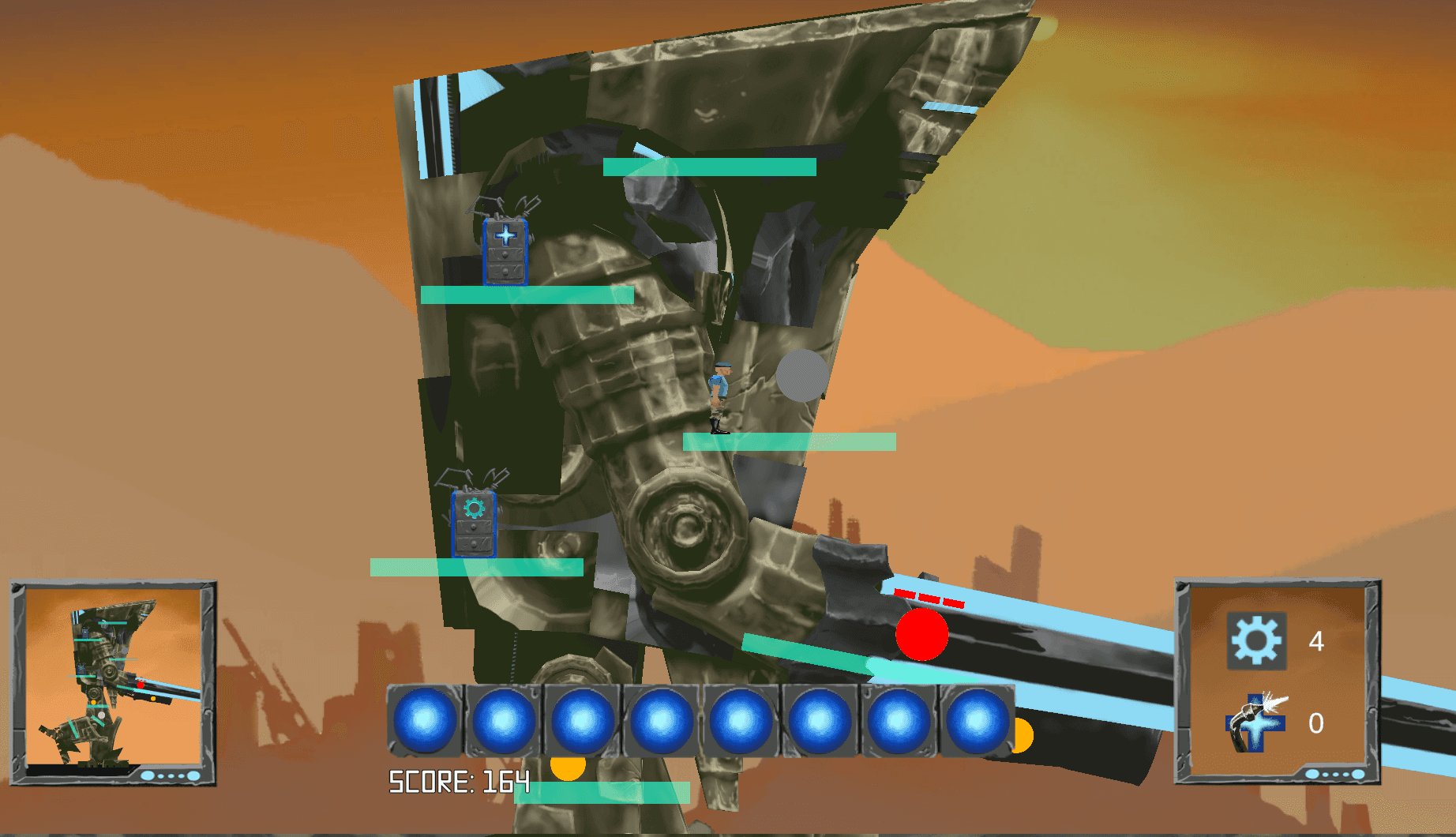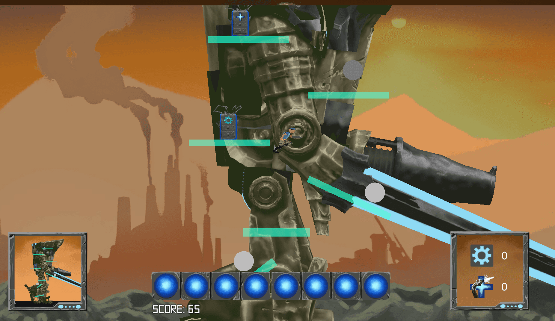 Ez egy 2D-s platformerszerű játék ahol egy hatalmas mozgó robotot kell megvédeni a támadások elől és segíteni, hogy végig tudjon haladni a pályán.